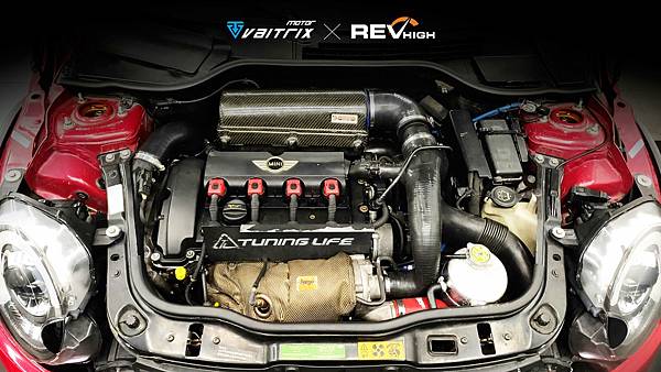 實力卓越的小鋼砲Mini Cooper S R56由渦輪增壓來強化動力,最大馬力至175hp,最大扭力則有24.5kgm的實力。車主先將愛車加大渦輪,並增加水噴射系統,降低進氣溫度讓潛在動力更好發揮。