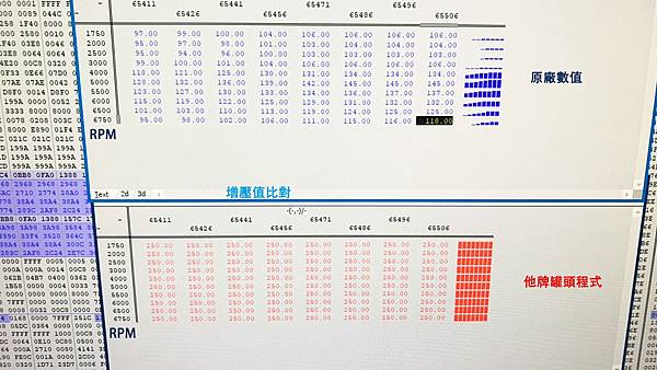 案例第二張照片的紅色數值為罐頭程式,所有數值不管轉速高低,皆寫入相同的數值,這就是罐頭的千遍一律的特質,為了將同一份程式合於各種車型,不管引擎機械作動方式,所有數值都寫到最高,連怠速也是,而沒有對應增壓線型,這也是客人反應不好開的原因。